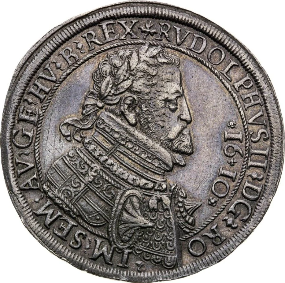 Portrait right, shoulders with pointy ornaments. Date vertical at right. Braided inner circle broken by bust below, touched by laurel above. Bust divides legend.
