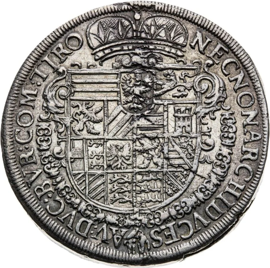 Crowned, ornate shield featuring a sixteen-fold coat of arms, a central Tyrolean eagle, and a surrounding circular chain of the Order of the Golden Fleece.