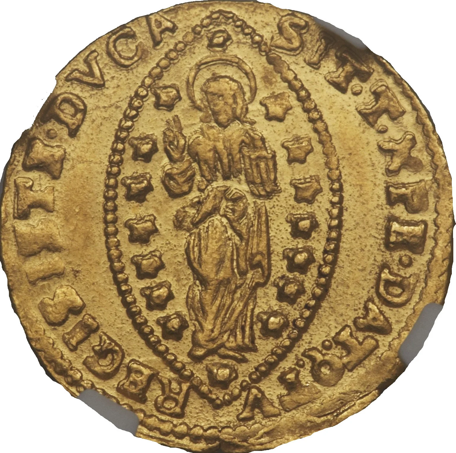Saint Mark presents his cross-topped staff to a kneeling doge.