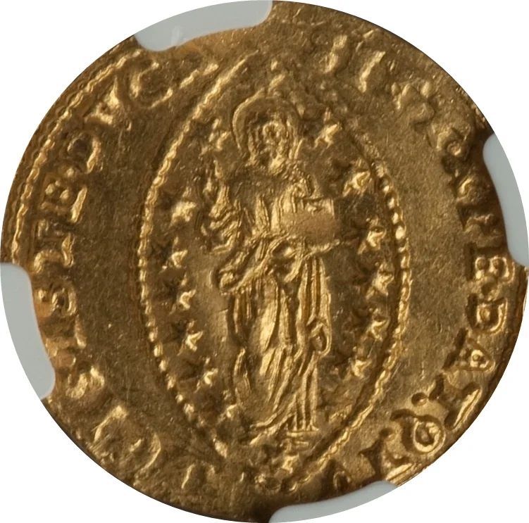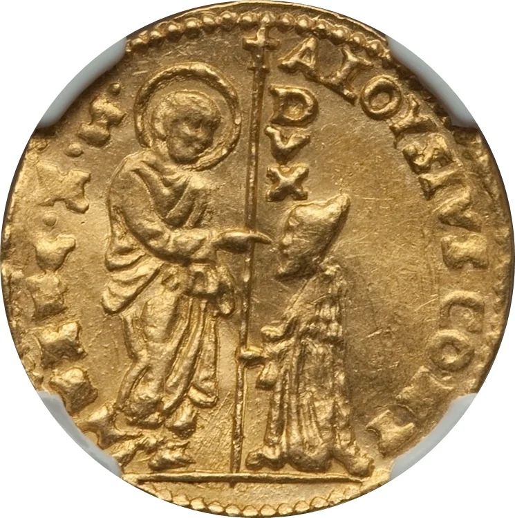 Saint Mark presents his cross-topped staff to a kneeling doge.