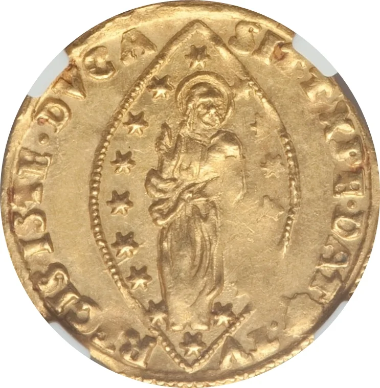 Saint Mark presents his cross-topped staff to a kneeling doge.