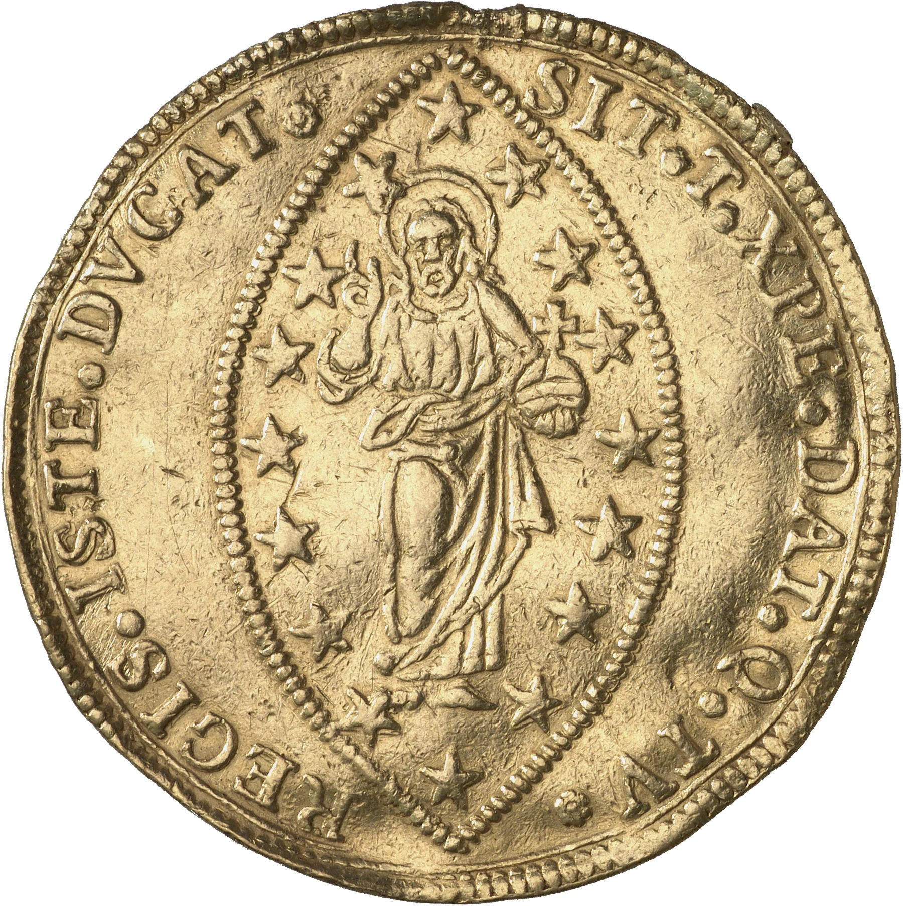 Christ in full-length, within a beaded oval ringed by widely spaced, large five-pointed stars.