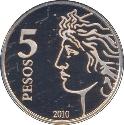The right half shows a partial institutional logo, with "5 PESOS" to its left and the year "2010" below.