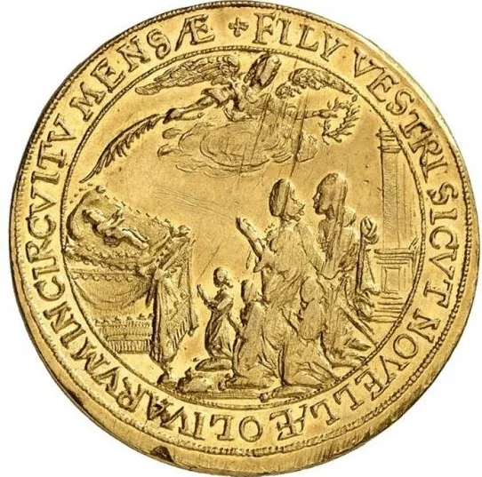 Family kneels before newborn prince, crowned by an angel with palm and wreath.