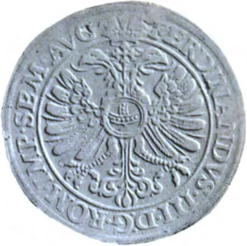 Imperial eagle with crown, breast orb, Ferdinand II's titles in legend.