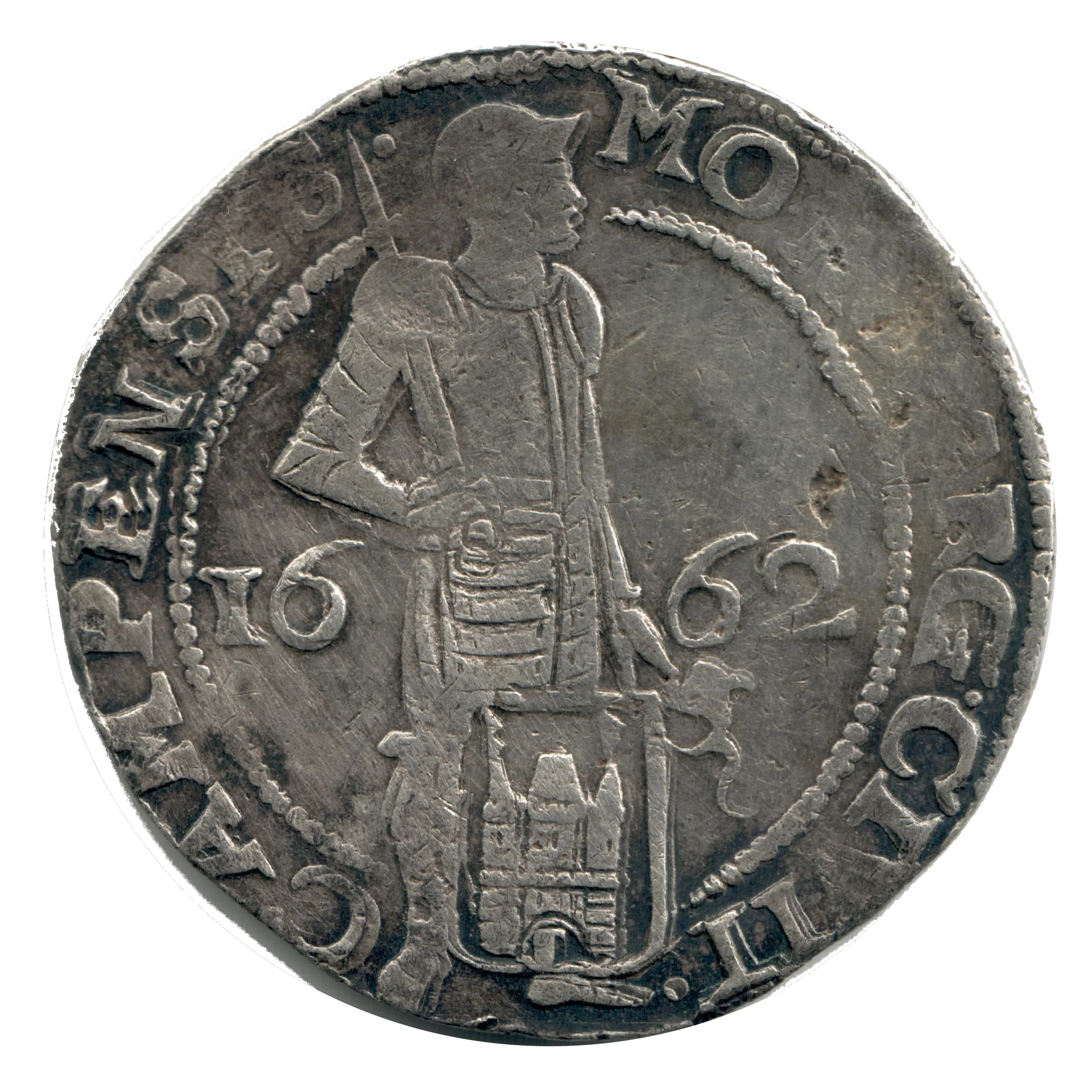 Knight in armor facing right, sword on shoulder, shield with Kampen coat of arms dividing the date within inner circle.