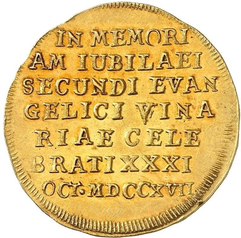 IN MEMORI / AM IUBILAEI / SECUNDI EVAN / GELICI VINA / RIAE CELE / BRATI XXXI / OCT . MDCCXVII