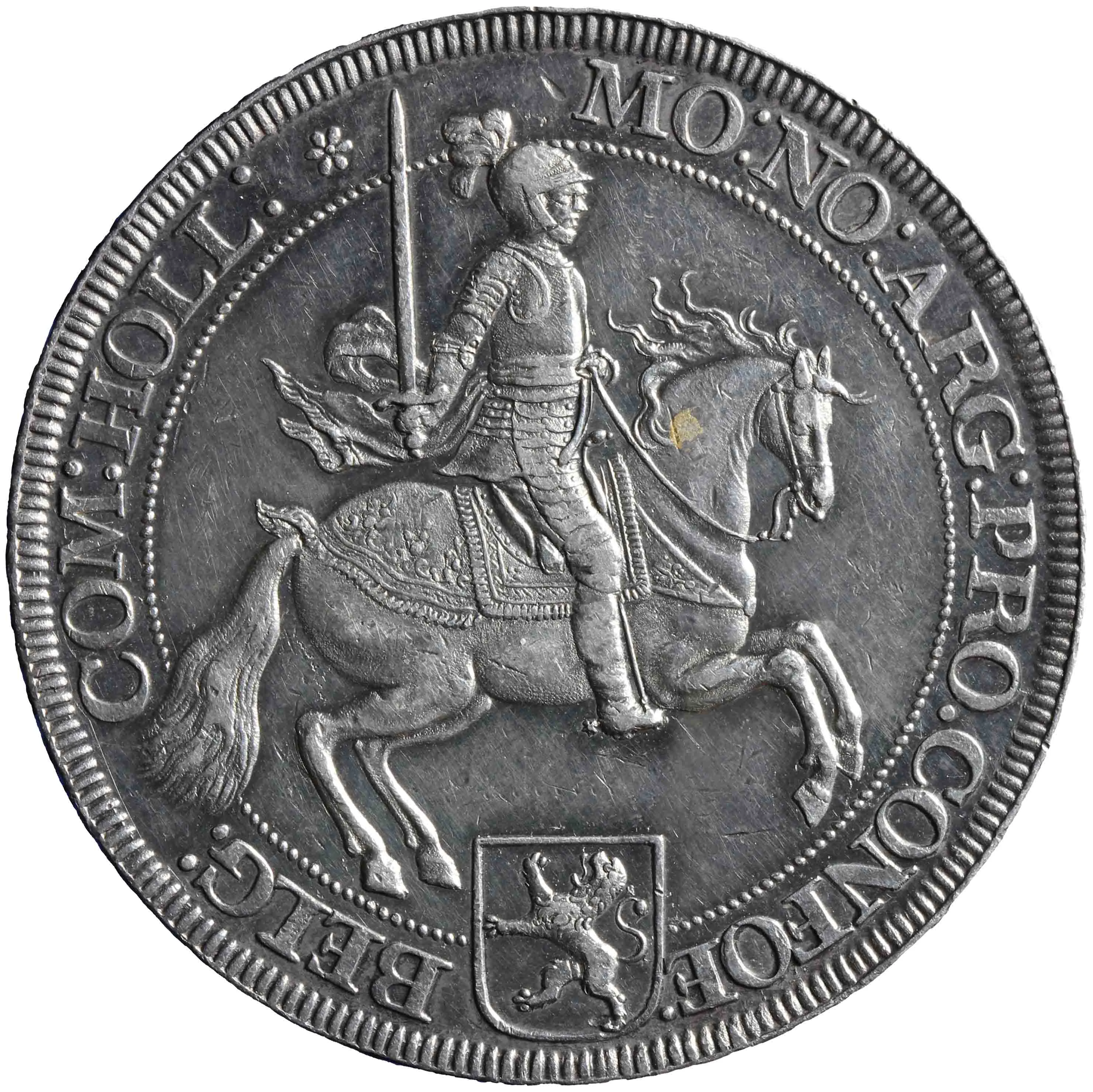 Knight on horse charging right over Holland’s crowned arms, within inner circle.