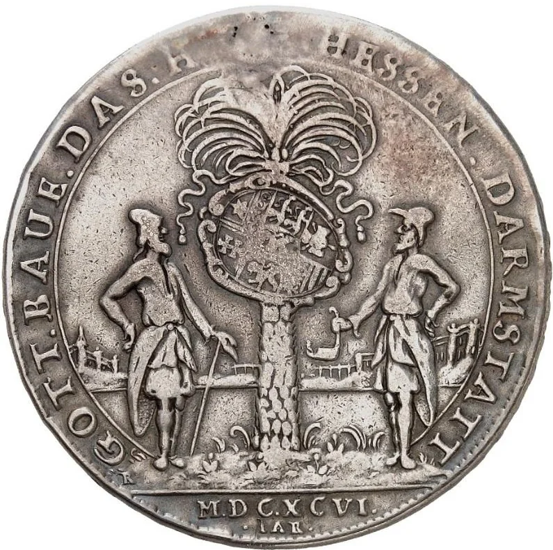 Two miners flank a baroque cartouche with seven-fold Hessian arms, under a sun and clouds, above a Roman numeral date.