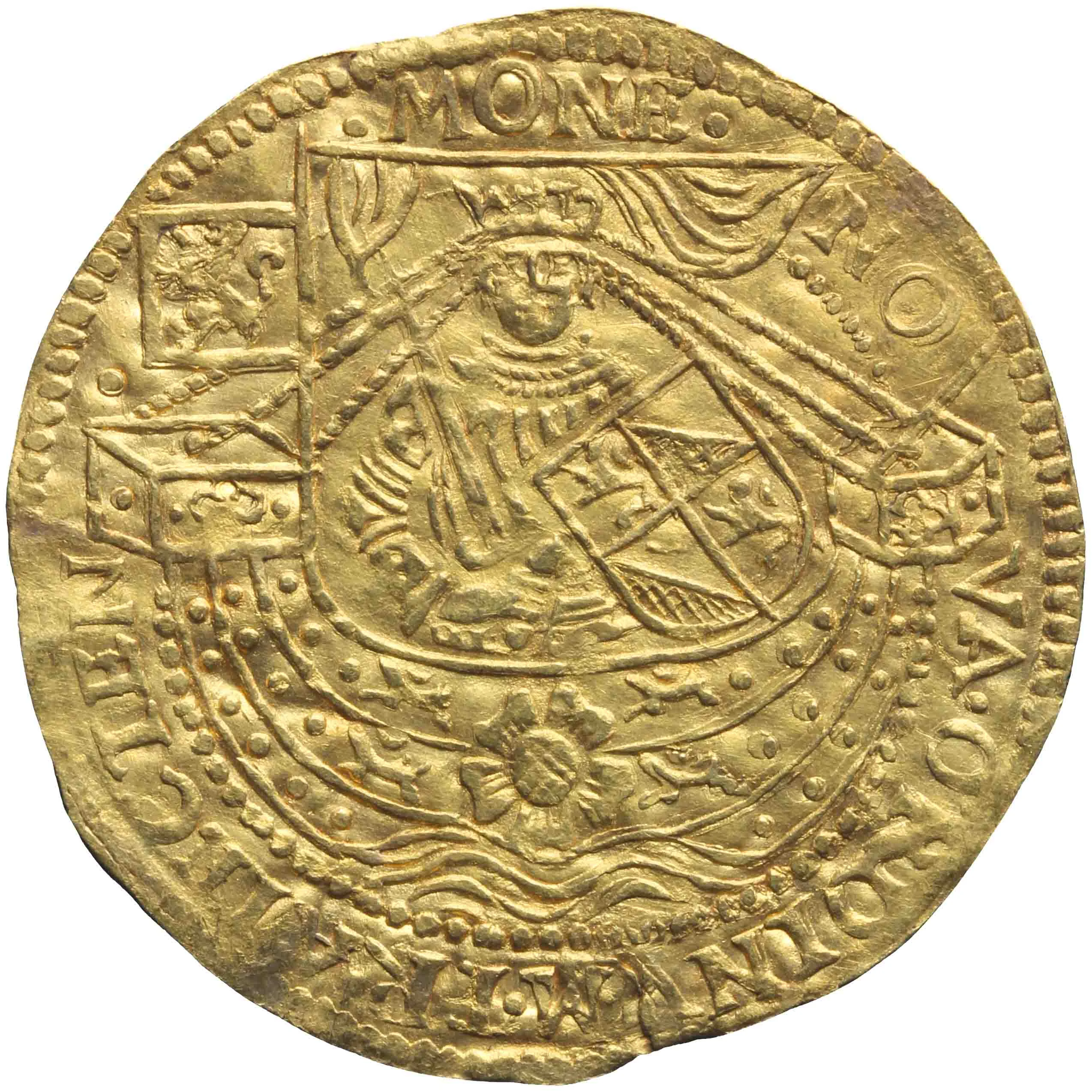 King on ship, sword in right hand, left holding shield. Lion banner on stern, rose on hull.
