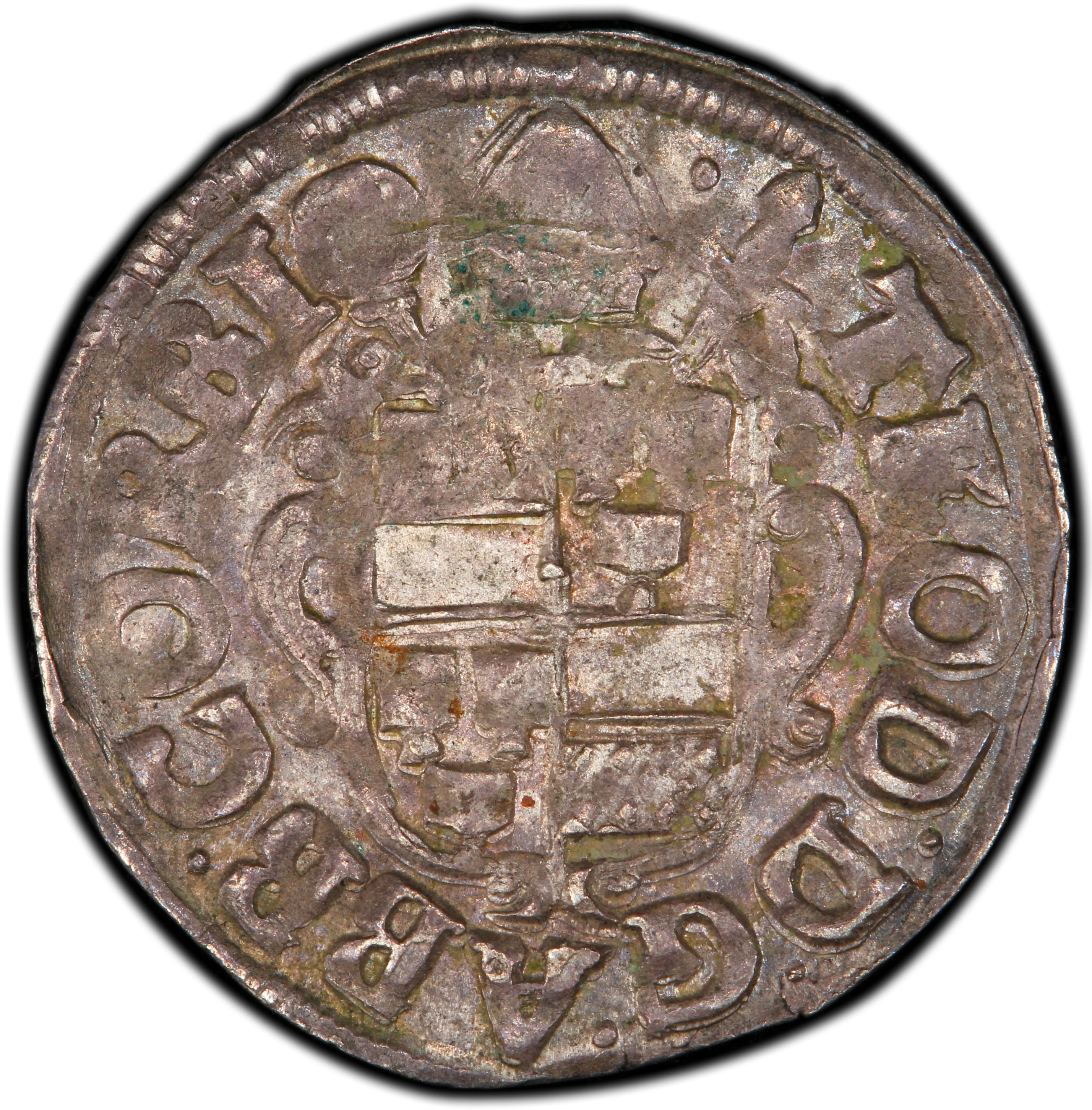Spanish shield with four quarterings in a baroque frame, overlaid with a crossed sword and crozier, topped by a mitre.