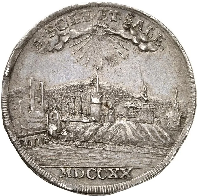 Cloud arms cradle a radiant wreath above Saalfeld, with Roman numerals below.
