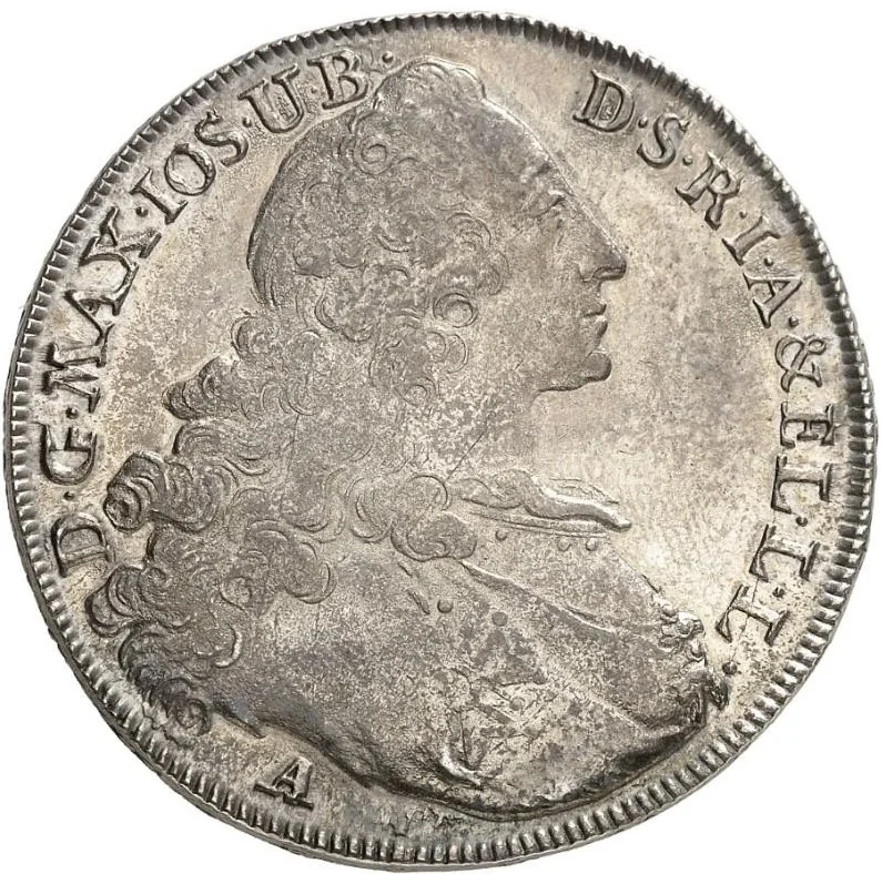 Crowned shield with quartered Bavarian and Palatine arms, central imperial orb, flanked by lions, two chains of orders, and date below.