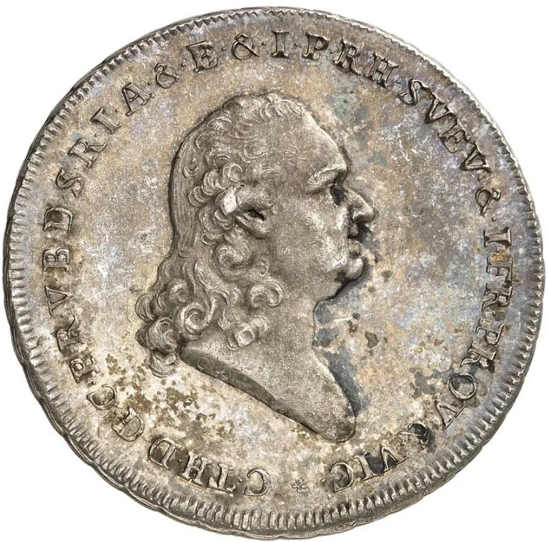 Description: Imperial eagle bearing the crowned Spanish shield with ninefold arms, four chains of orders suspended from its sides and breast, date divided below.