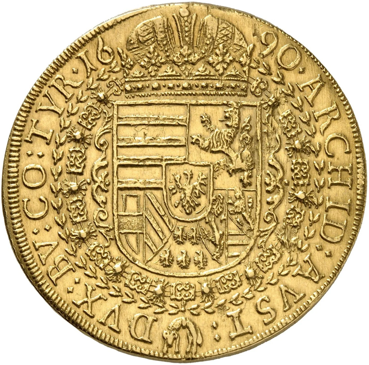 Crowned shield with Tyrol arms at center, encircled by the Golden Fleece chain within a wreath. Decorations between shield and chain. Divided date above.