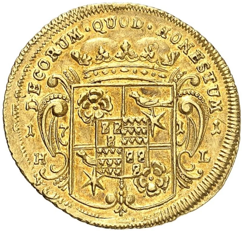 Crowned baroque shield divides date.