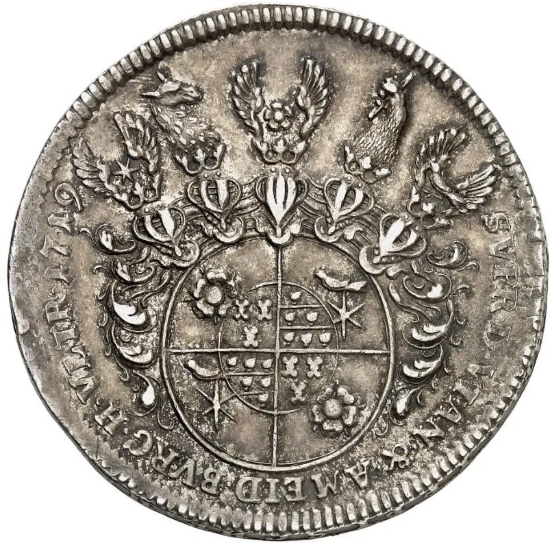 Arms with helmet, dated legend.
