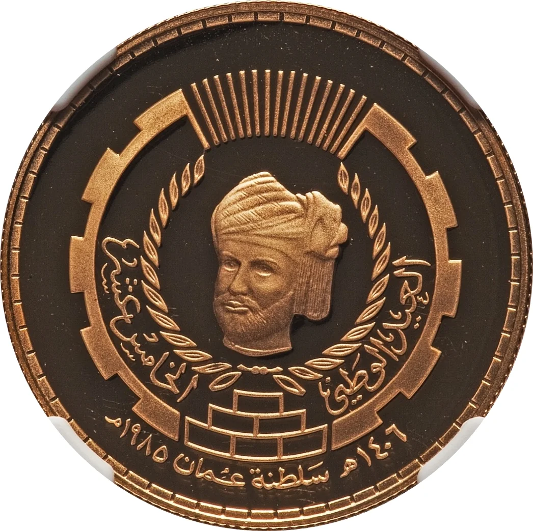 Sultan Qaboos portrait facing left within a wreath and decorative border.