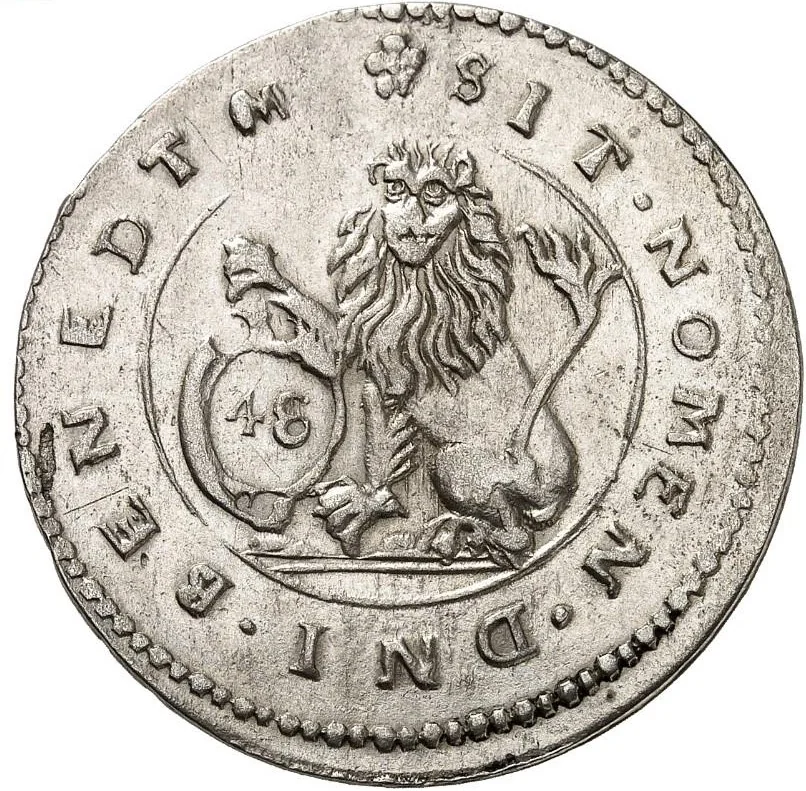 Lion seated right, holding ornate frame with "48" within double linear circles.