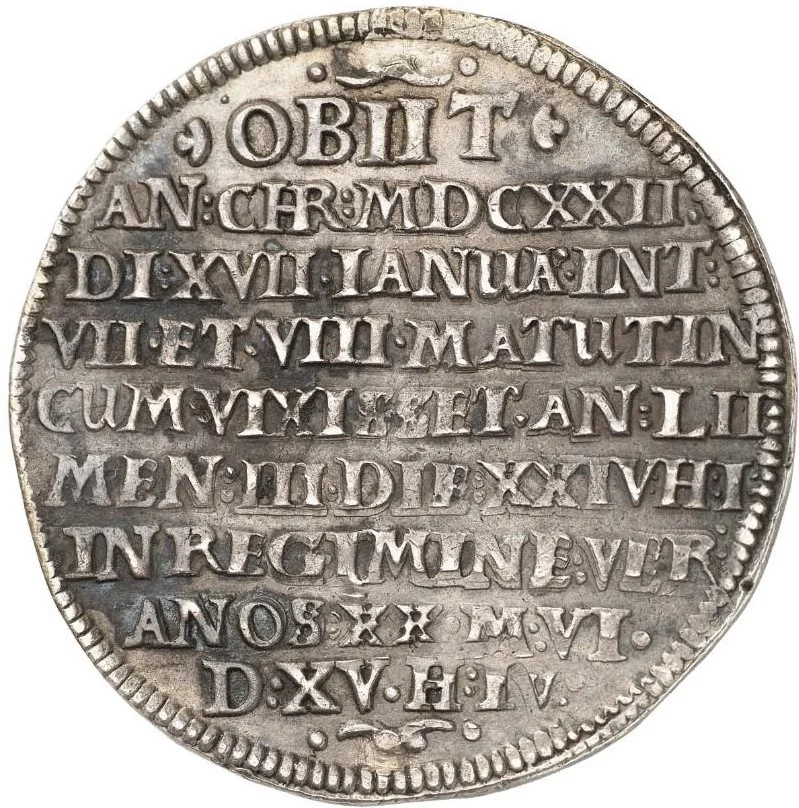 OBIIT / AN: CHRI: MDCXXII / DIE. XVII. IAN(U)(VA). INTE / VII ET VIII. MATVTIN / C(U)(VM) VIXISSET. A. LII. / MEN. III. DIES. XXIV. H. I. / IN REGIMINE VERO / ANOS. XX. M. VI. / D. XV. H. IV.