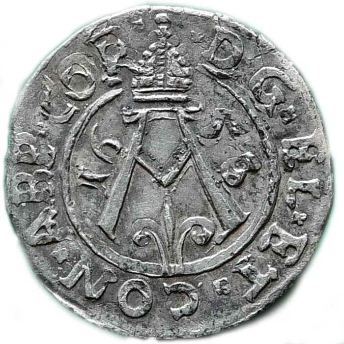 Initials "A" within the divided year 16-53, above a miter and below a lily. The miter interrupts the inner circle and inscription.