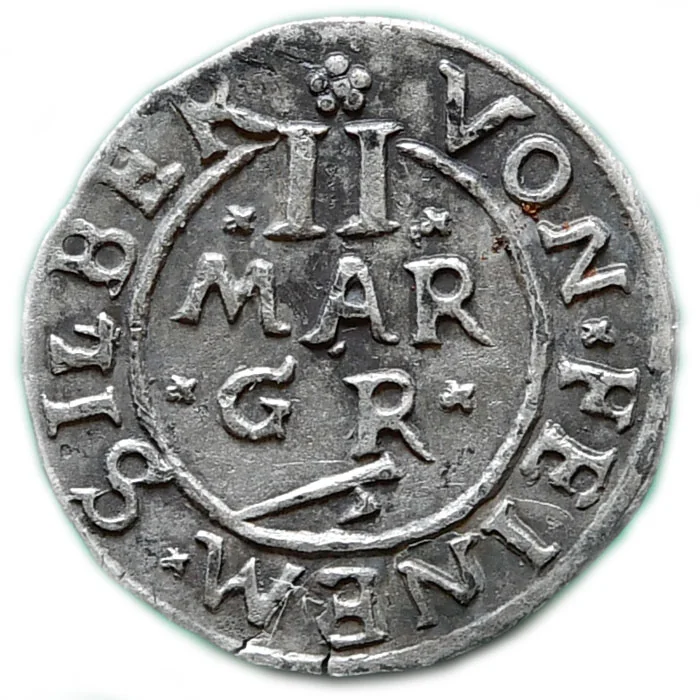 Three lines show the value, including the mint mark. The numeral "II" breaks the inner circle and inscription, above which is a rosette.