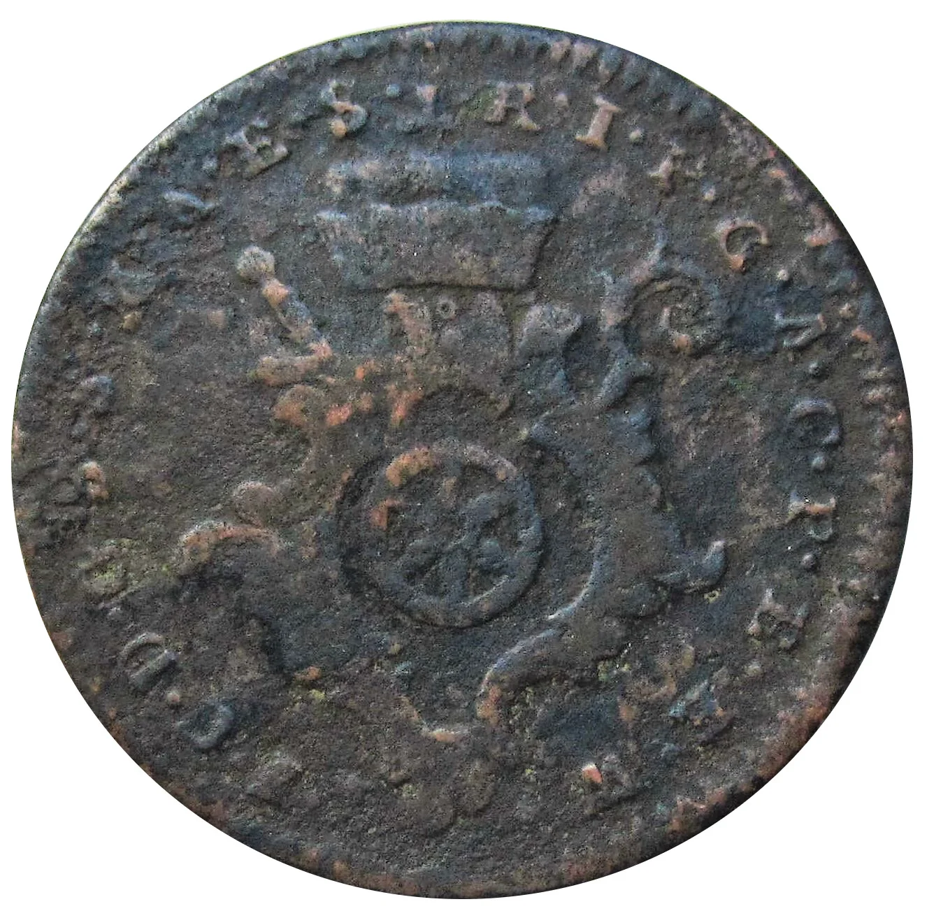 Crowned arms with sword and crozier in baroque frame, encircled by legend.