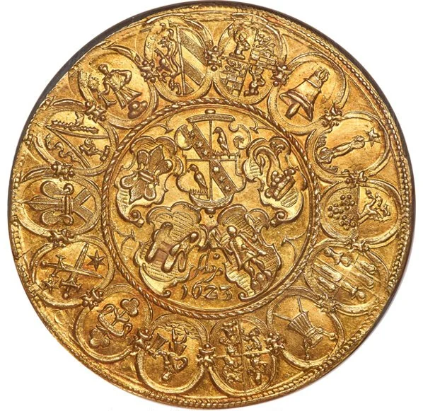 Central shield with date, encircled by 14 arms.