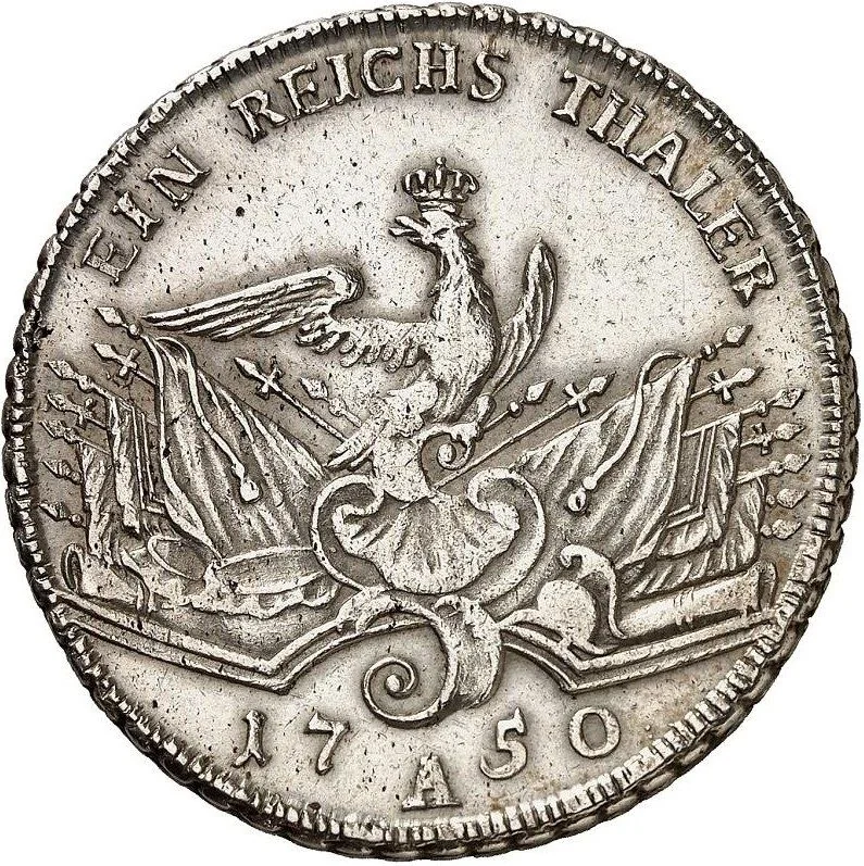 Crowned eagle on war trophies, head left, with flags and spears behind.