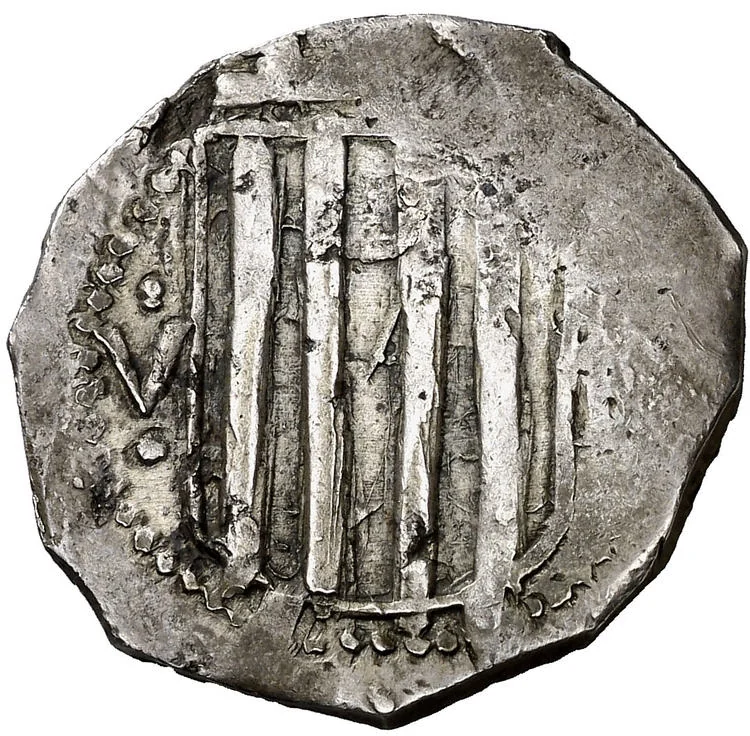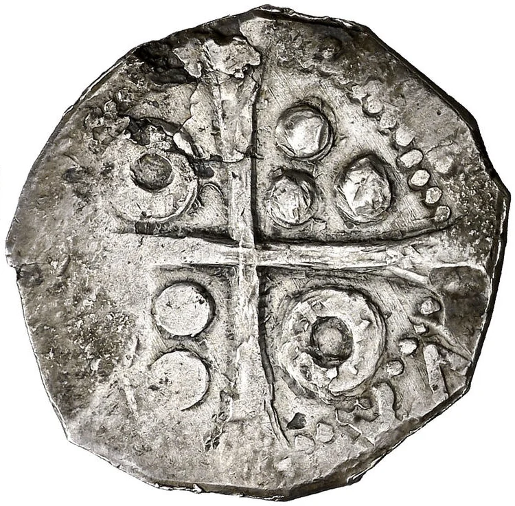 Cross divides legend, annulet in first and fourth quarters, three bezants in second and third. Legend between beaded circles.