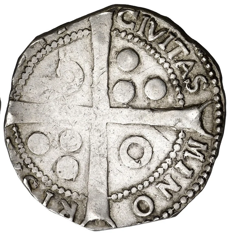 Cross divides legend, annulet in first and fourth quarters, three bezants in second and third. Legend between beaded circles.