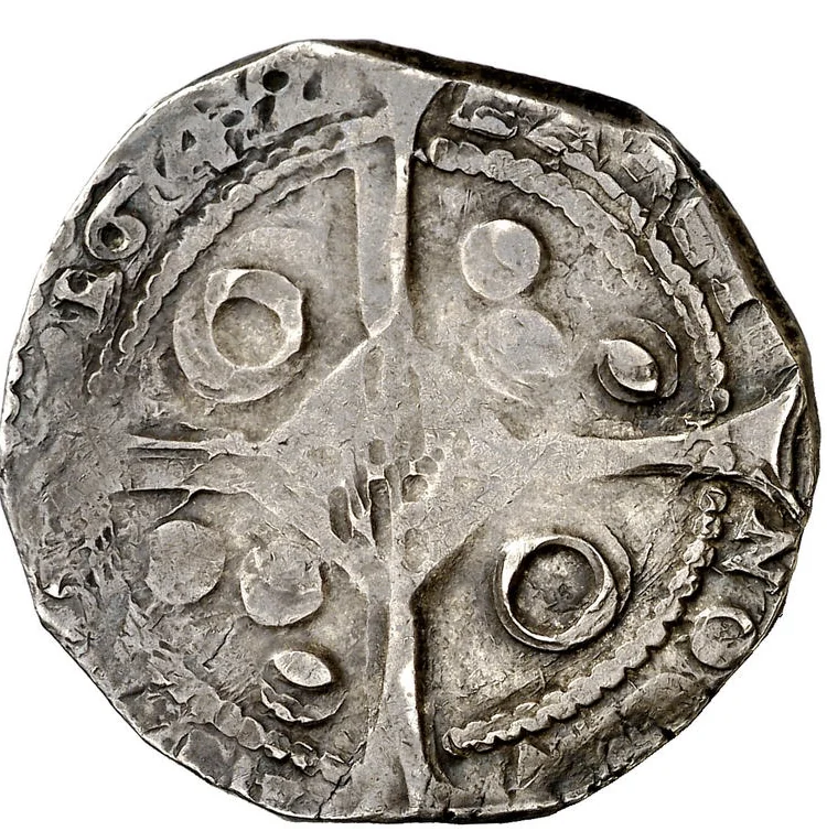 Cross divides legend, annulets at angles one and four, three bezants at two and three. Central lozenge shield. Legend between beaded circles.