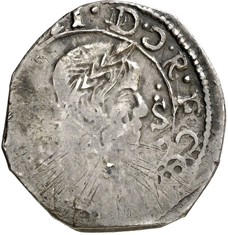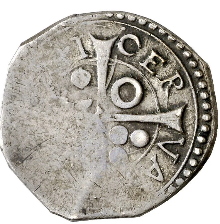Cross divides legend, annulet in second and third quarters, three bezants in first and fourth. Legend between beaded circles.