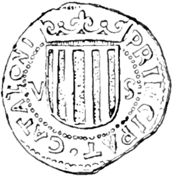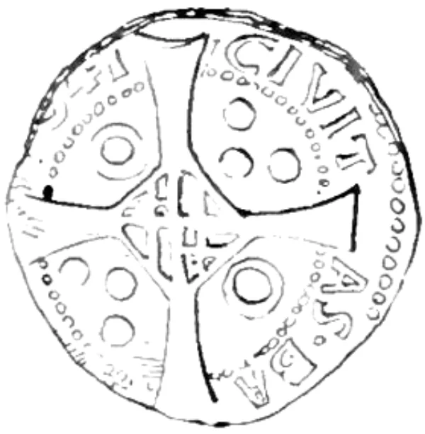 Cross divides legend, annulets at angles one and four, three bezants at two and three. Central lozenge shield. Legend between beaded circles.