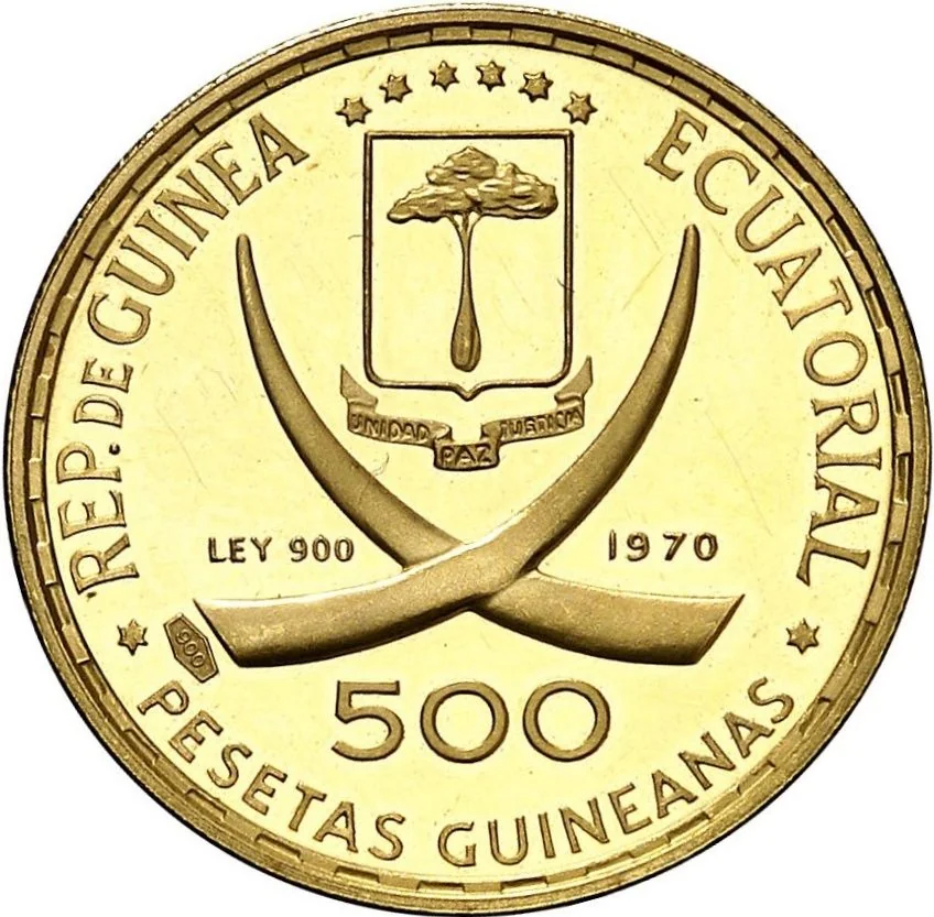 Description: Coat of arms of Equatorial Guinea above crossed elephant tusks.