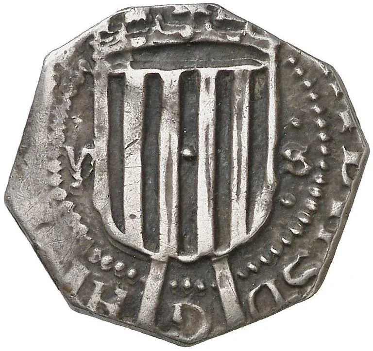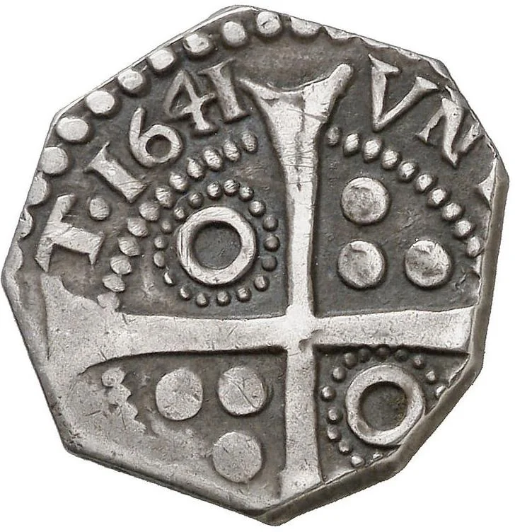 Cross divides legend, annulet in first and fourth quarters, three bezants in second and third. Legend between beaded circles.