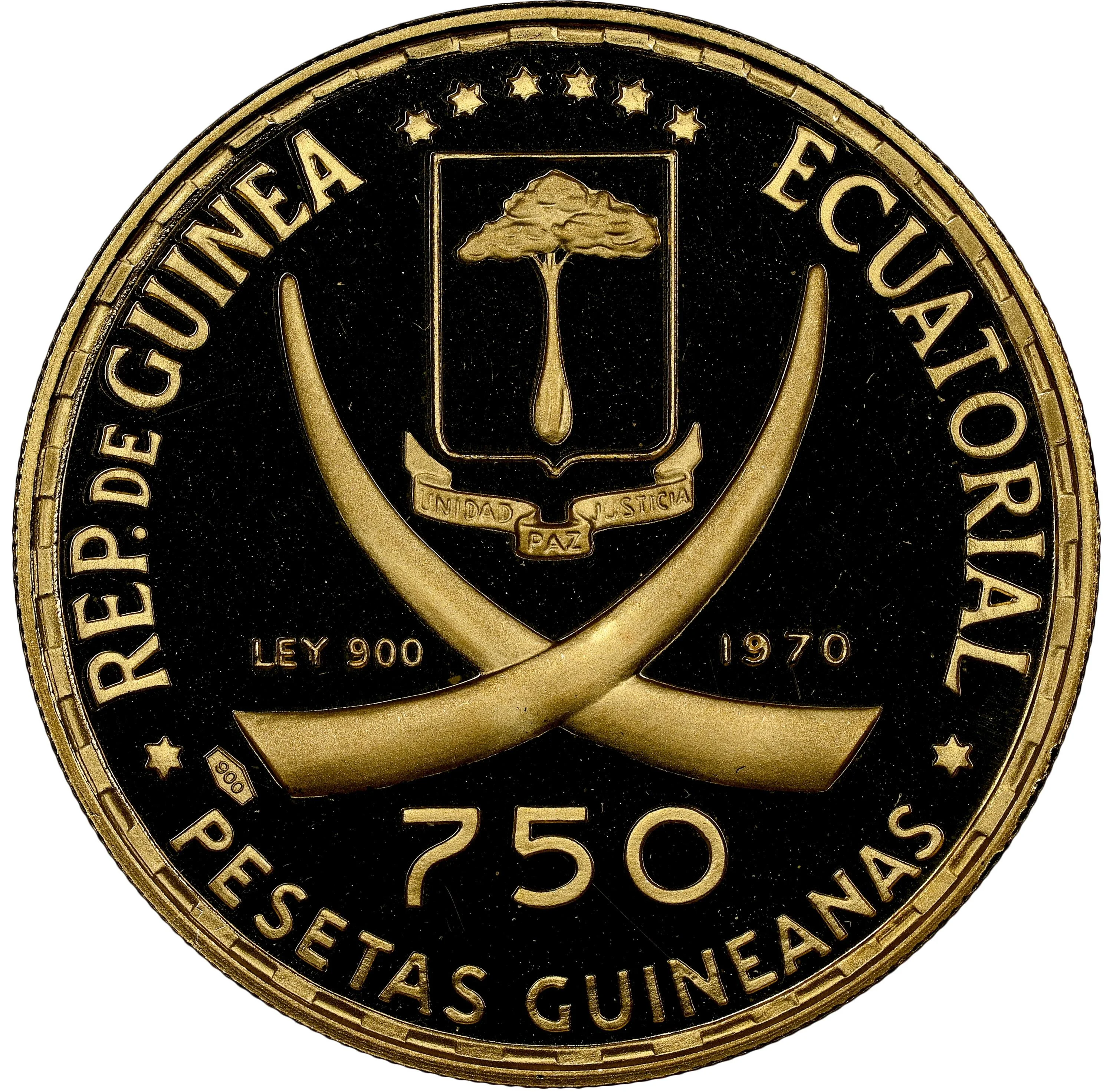 Coat of arms of Equatorial Guinea above crossed elephant tusks.