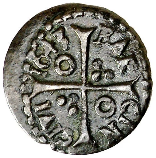 Cross divides legend; annulet in first and fourth quarters, three bezants in second and third. Legend within beaded circle.