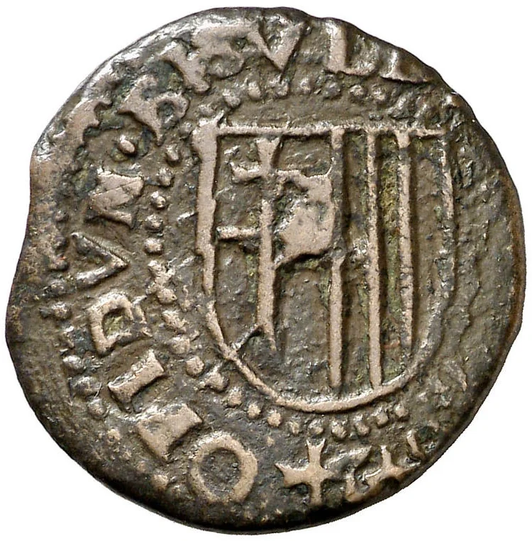 Shield with four pales, crowned. Circular legend between beaded borders.