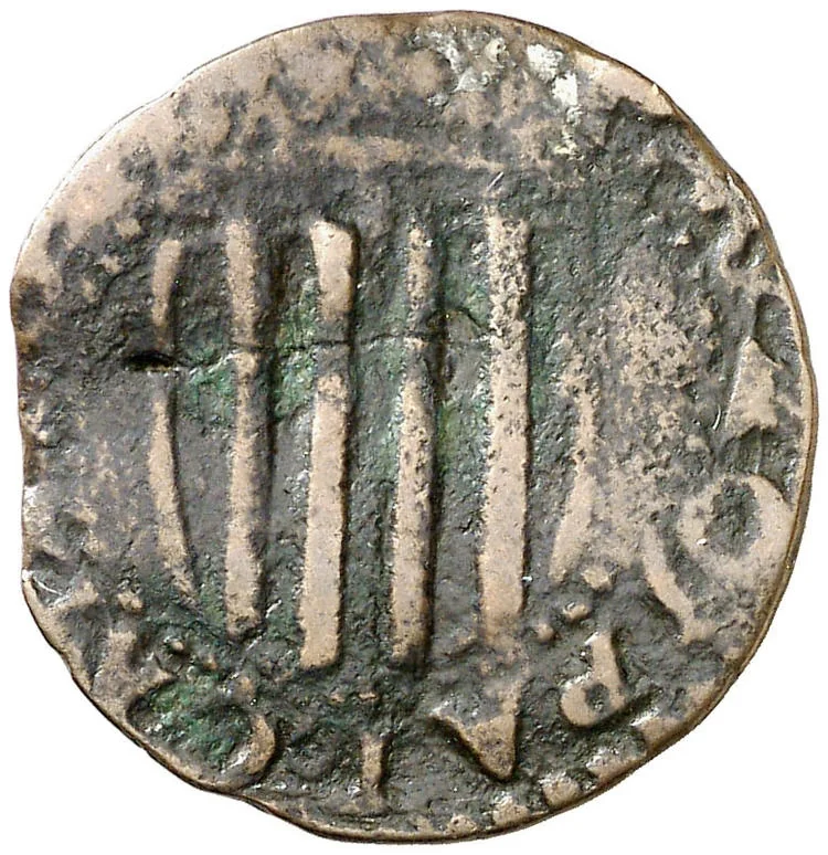 Shield with four pales, crowned. Circular legend between beaded borders.