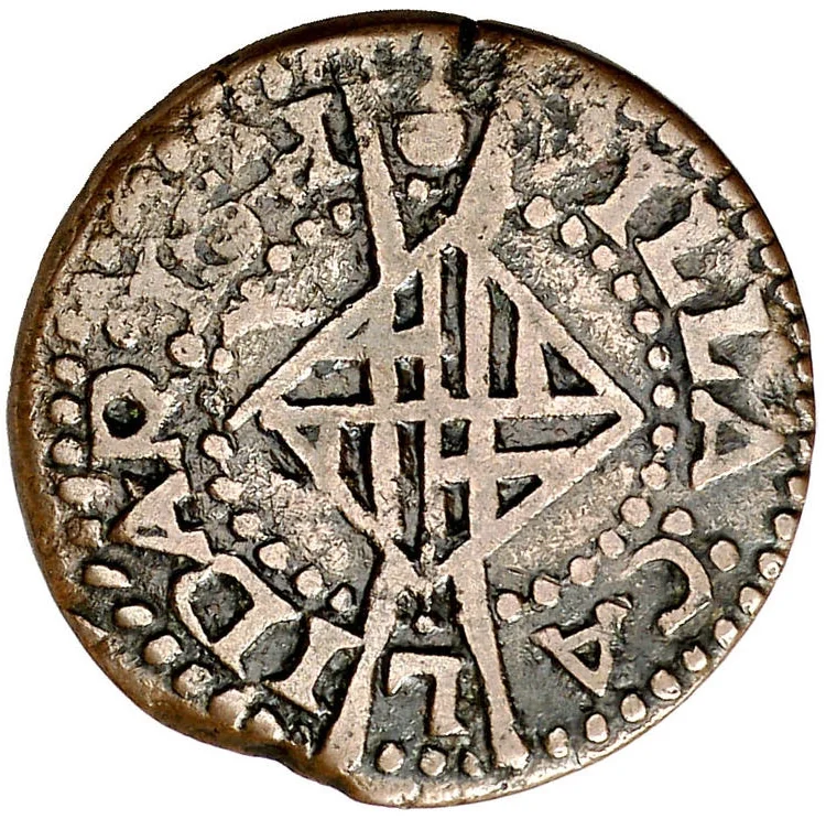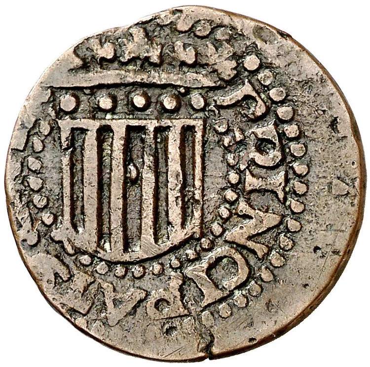 Shield with four pales, crowned. Circular legend between beaded borders.