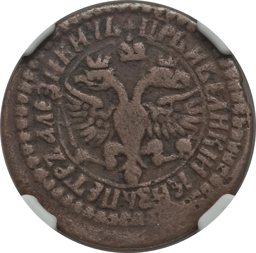 In 1701, the currency system of the Russian Empire was in a state of profound crisis and transformation, driven by the fiscal demands of the Great Northern War (1700-1721). Tsar Peter I, engaged in a costly conflict with Sweden, faced a severe shortage of silver, the traditional metal for high-denomination coins. To finance his military ambitions and the modernization of the state, he resorted to a drastic debasement of the coinage. The government significantly reduced the silver content in existing coins like the kopeck and, most notably, began minting large quantities of new copper coins—the denga and polushka—and mandating they be accepted at the same value as their silver predecessors.