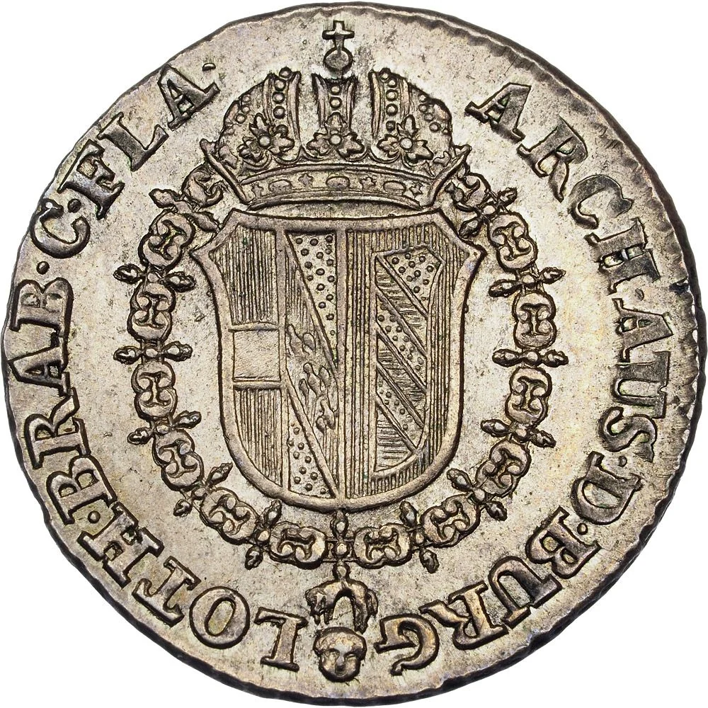 Crowned Habsburg-Lorraine arms with the Golden Fleece chain, mint mark below. Latin legend surrounds.