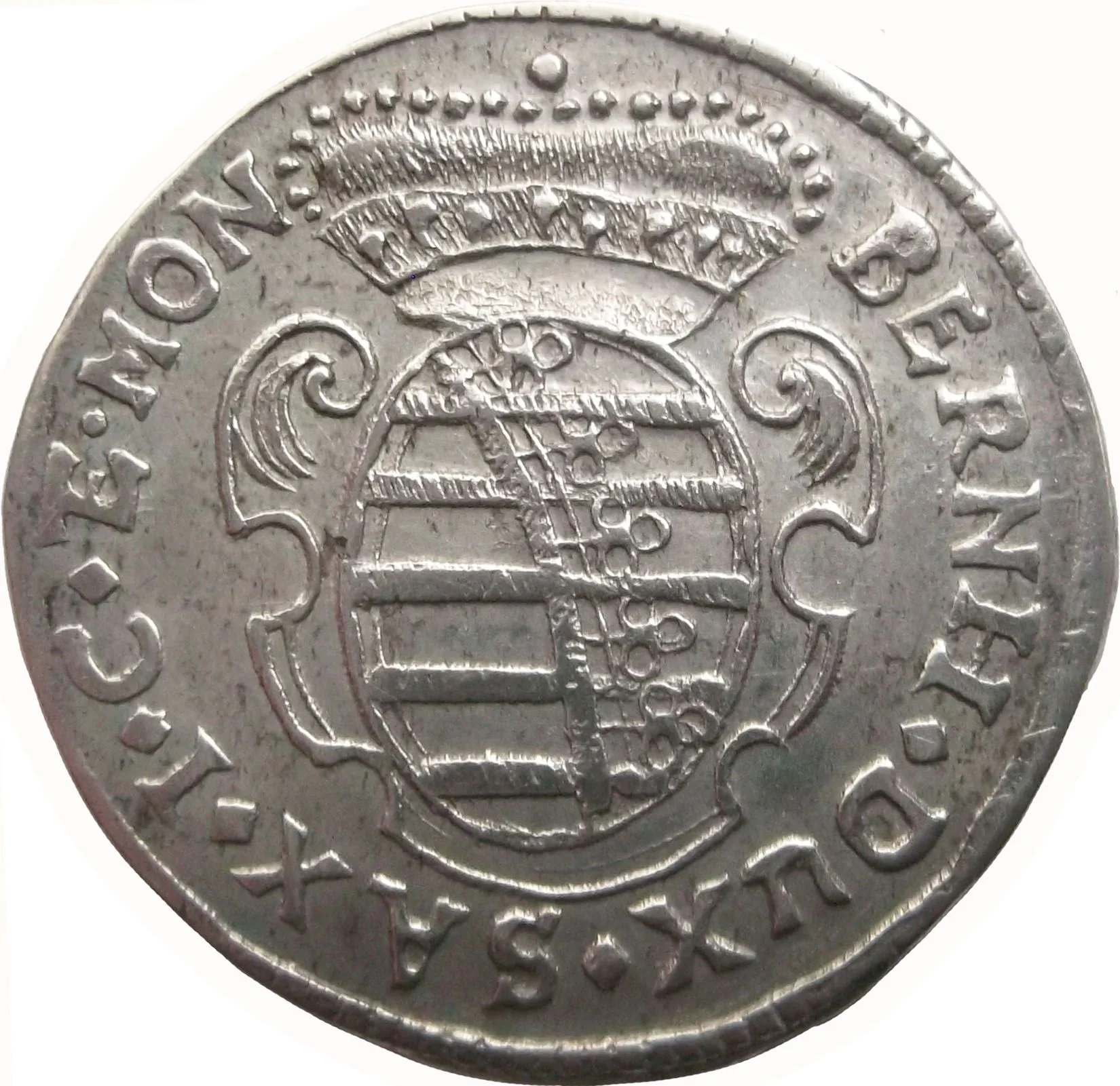 Crowned oval arms of Saxony in a baroque frame with encircling inscription.
