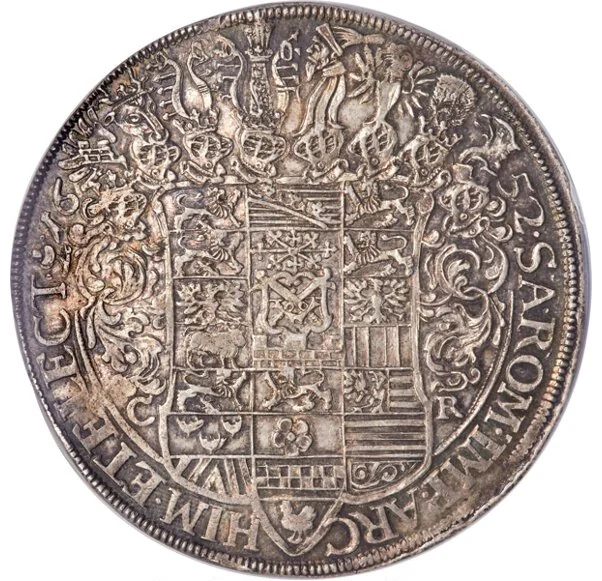 Coat of arms with 22 fields and 8 helmets, flanked by mint masters' initials and encircled by an inscription.
