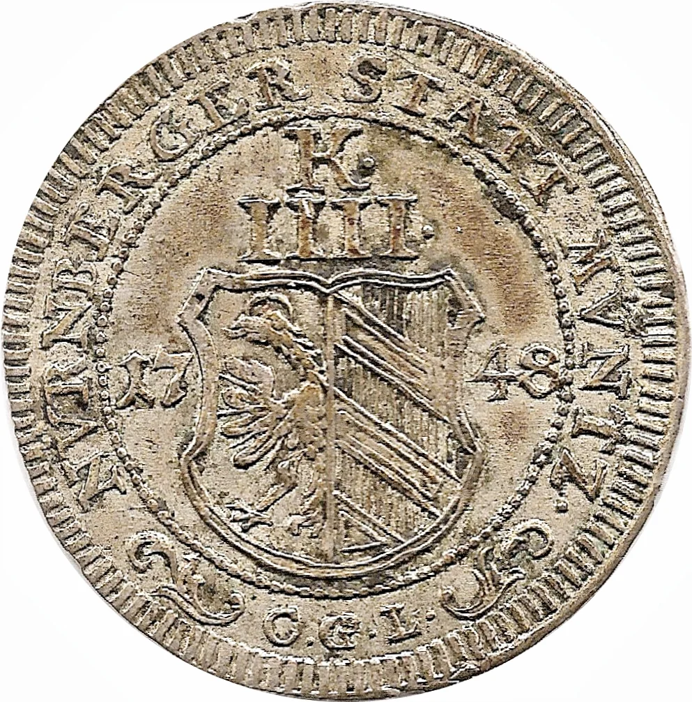 Nuremberg coat of arms, splitting the date 17-48. Face value "K .IIII." above.