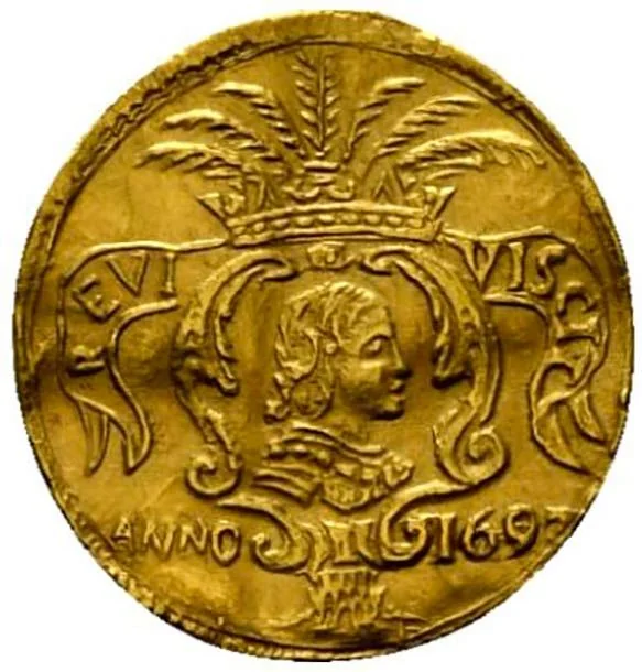 Armored bust right in baroque frame. Crown with seven palm fronds above. Ribbon with "REVI - VISCIT" at sides, "ANNO" and date below. No legend.