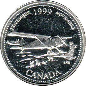 “The Airplane Opens the North” depicts a bush plane instrumental to Northern Canada’s development, encircled by the country’s name and the bilingual date “NOVEMBER 1999 NOVEMBRE.”