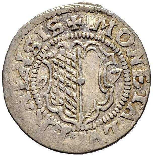 Lucerne coat of arms on a gothic shield: left field diamond-hatched, right field with offset outline. "9" left, "7" right.