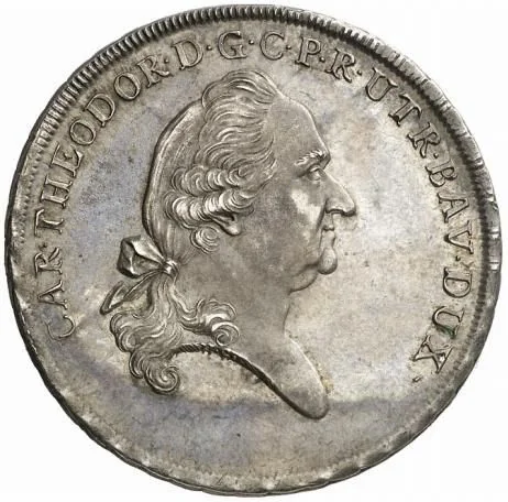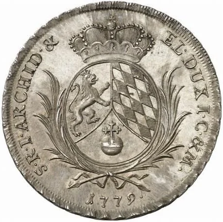Shield with Pfalz, Bavaria, and imperial orb arms, crowned and flanked by palms, dated below.
